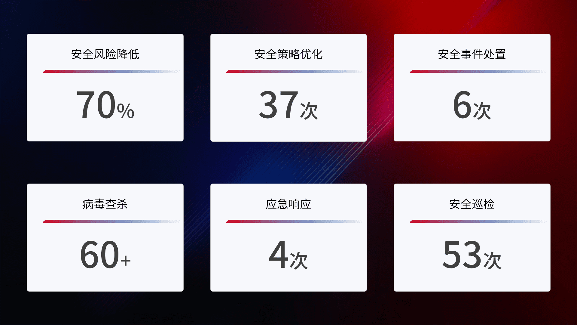 提供全面的安全事件报告体系,,,,包括处置报告、、、、周报、、、季度和年度总结,,,结合持续监控,,帮助客户深入了解网络安全状况。。。。