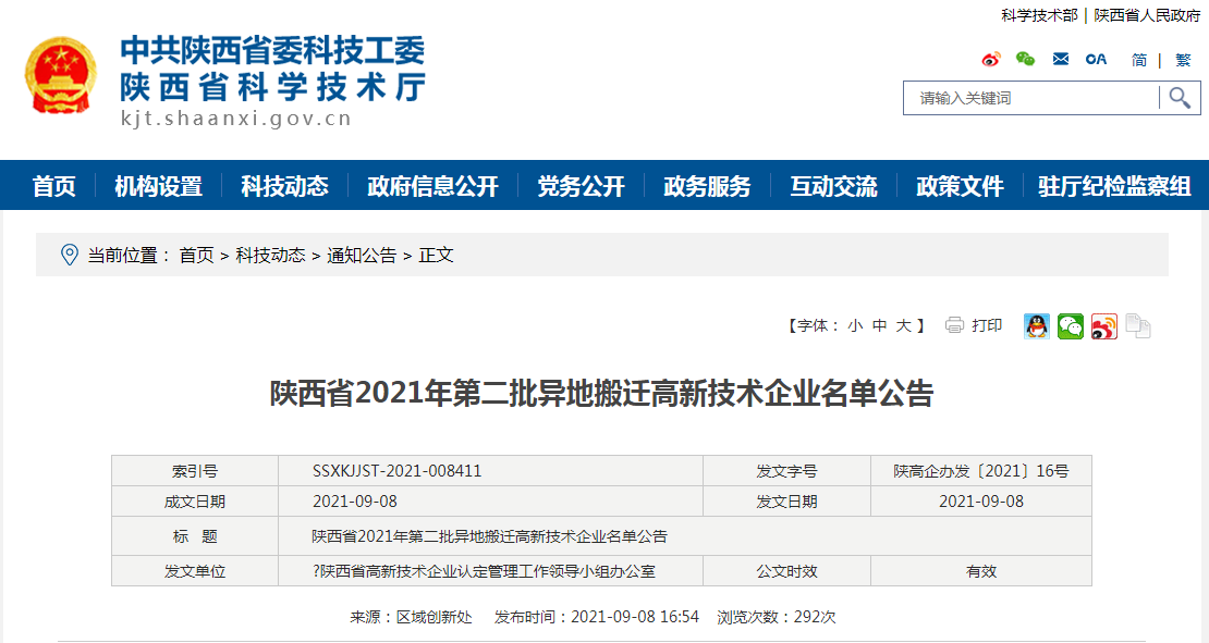 陕西省2021年第二批异地搬迁高新技术企业名单公告