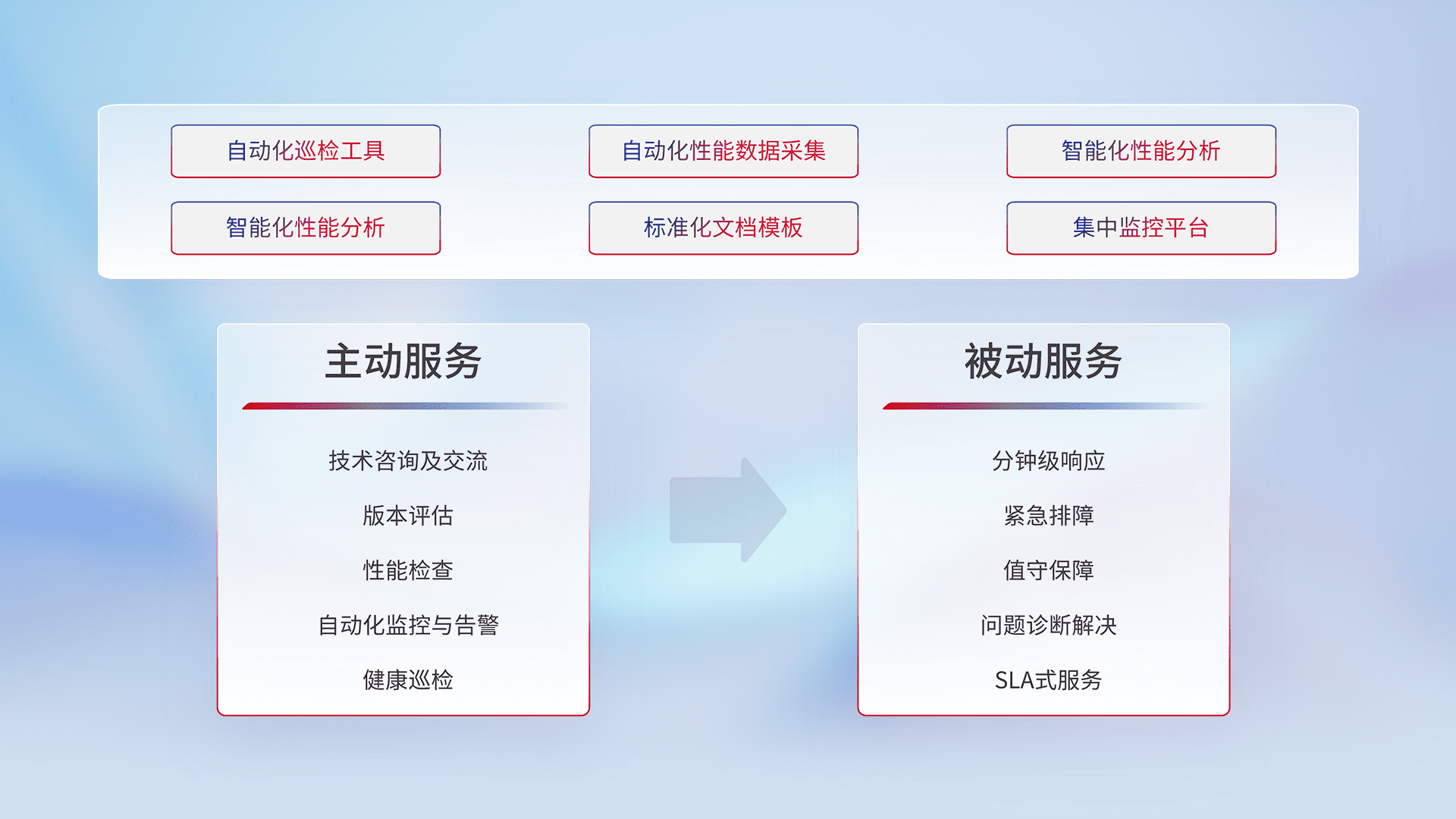 智能化工具和标准化文档,,,保障服务质量,,提供主动服务(包含技术咨询、、、、版本评估、、、性能检查、、自动化监控与告警、、健康巡检)和被动服务包含(分钟级响应、、紧急排障、、、、值守保障、、、问题诊断解决、、、SLA服务)。。。。